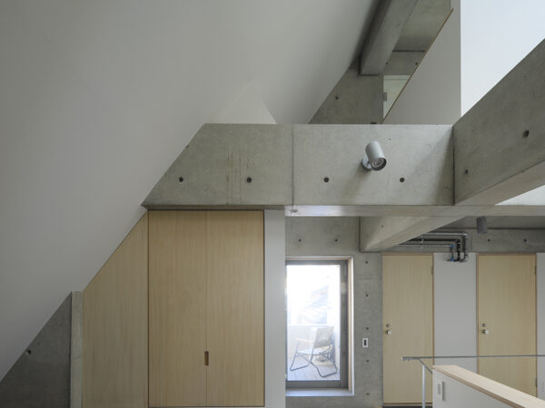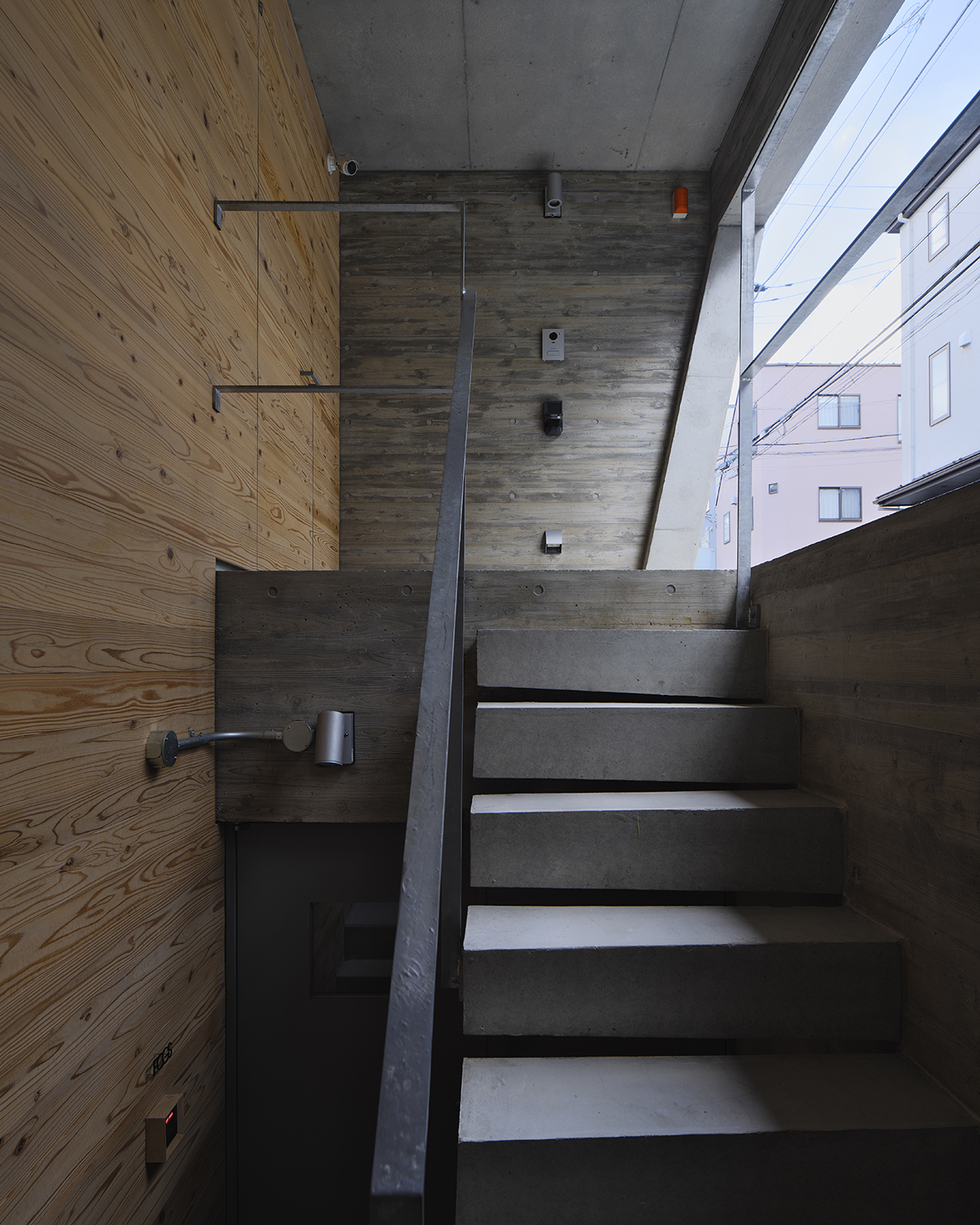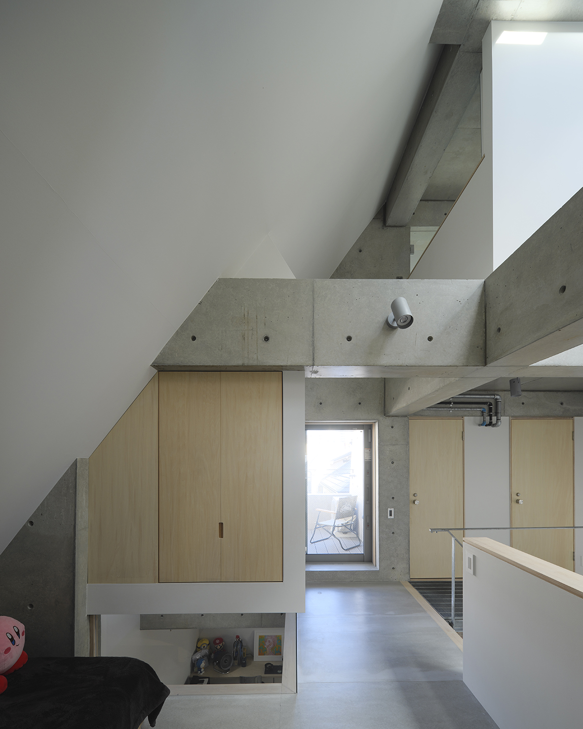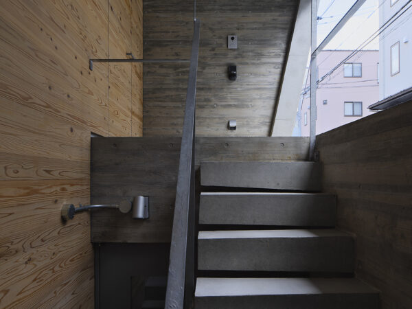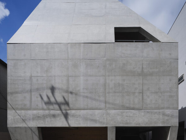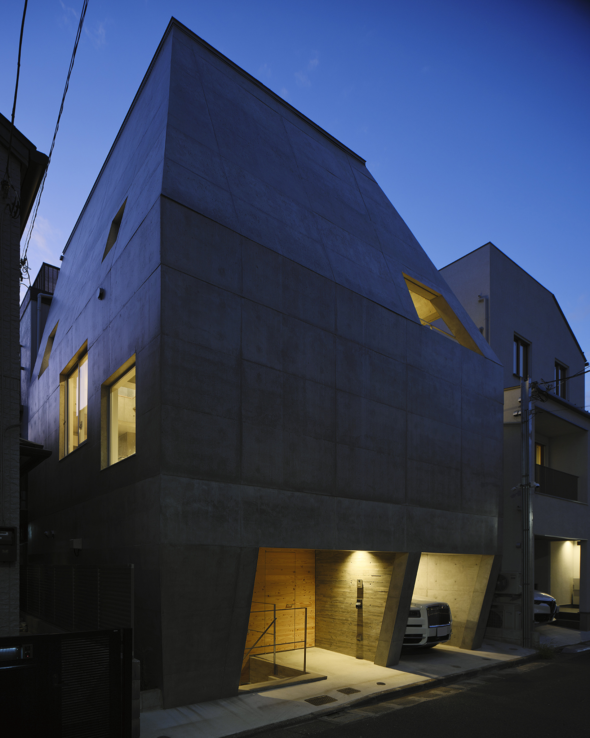 敷地は東京都心部の密集した住宅街に位置します。敷地内の空地を少しでも広げようと、また、空からの恩恵を少しでも受けようと、外壁をナナメに建てました。こうして岩石が今にも動き出しそうな造形がつくられています。