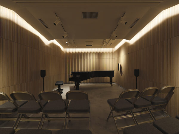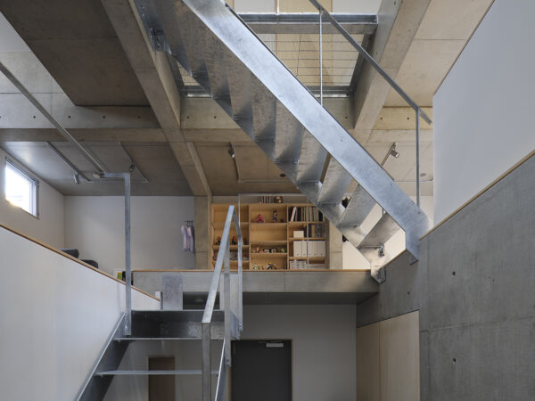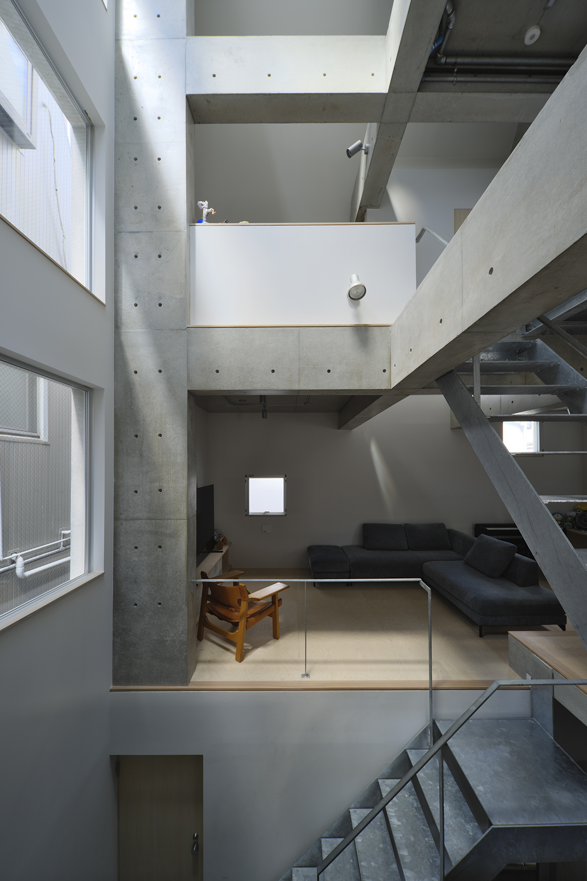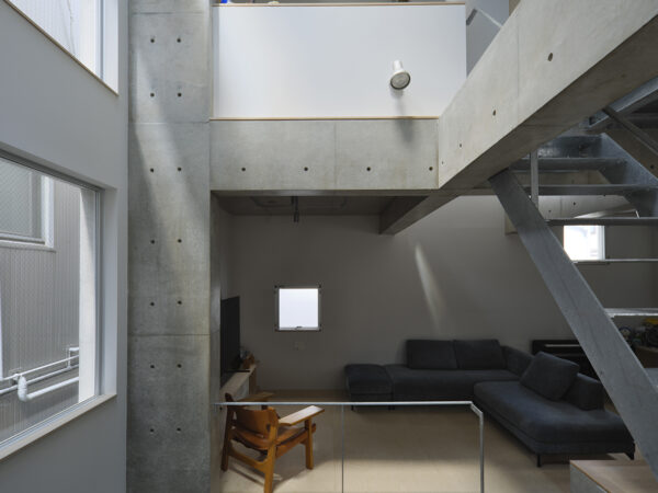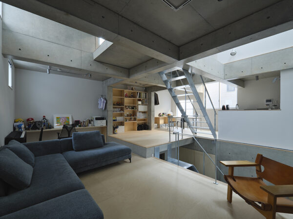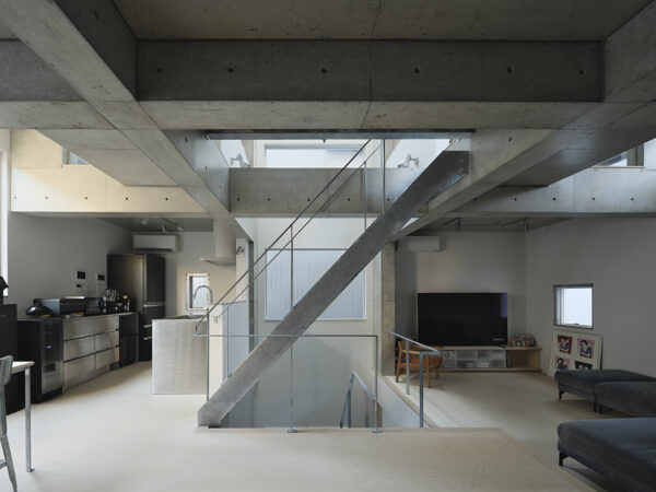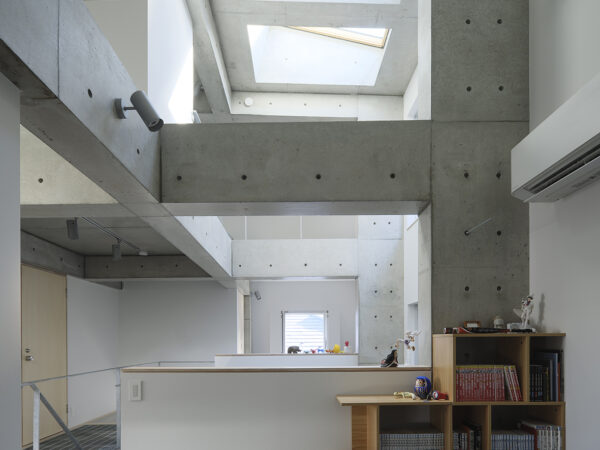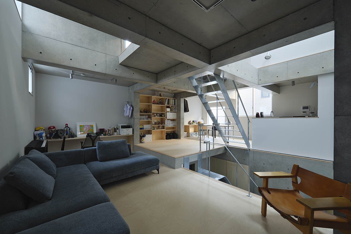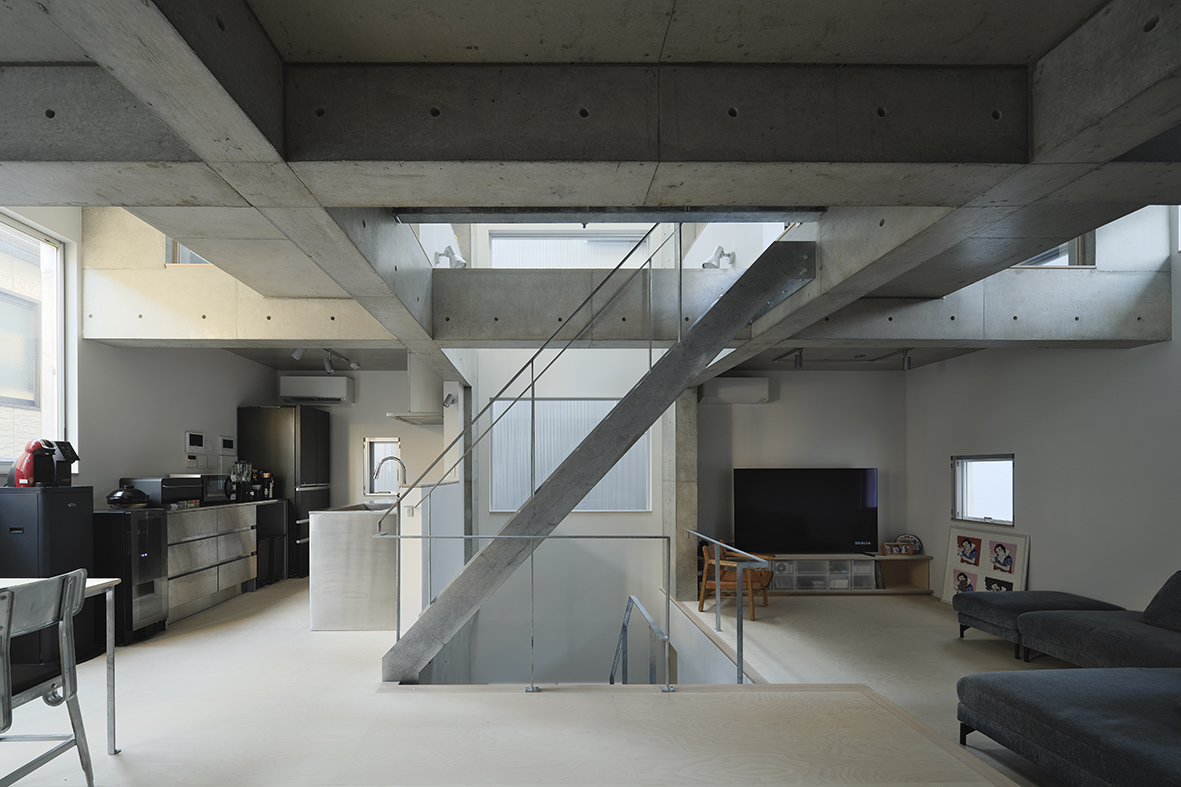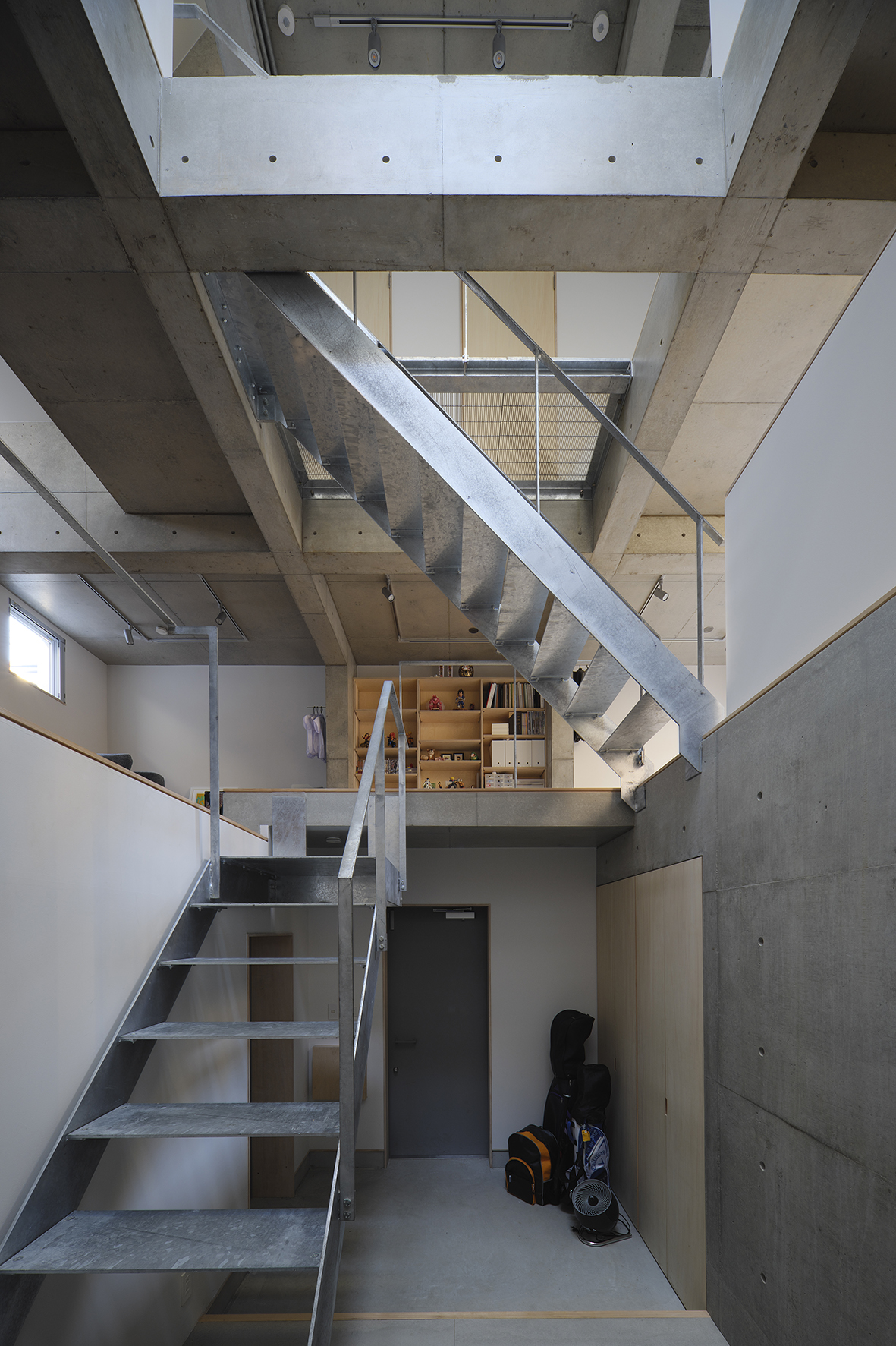 地上層を貫く洞穴のような吹抜けは、都市の確保しづらい空地を住宅内に取り込もうとしています。断面的にもひとつの大きな空間の中で、視線の抜け、家族の生活、さまざまな方向から享受される光や風を感じることができます。