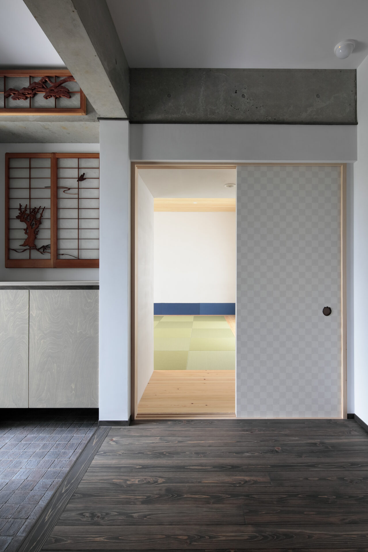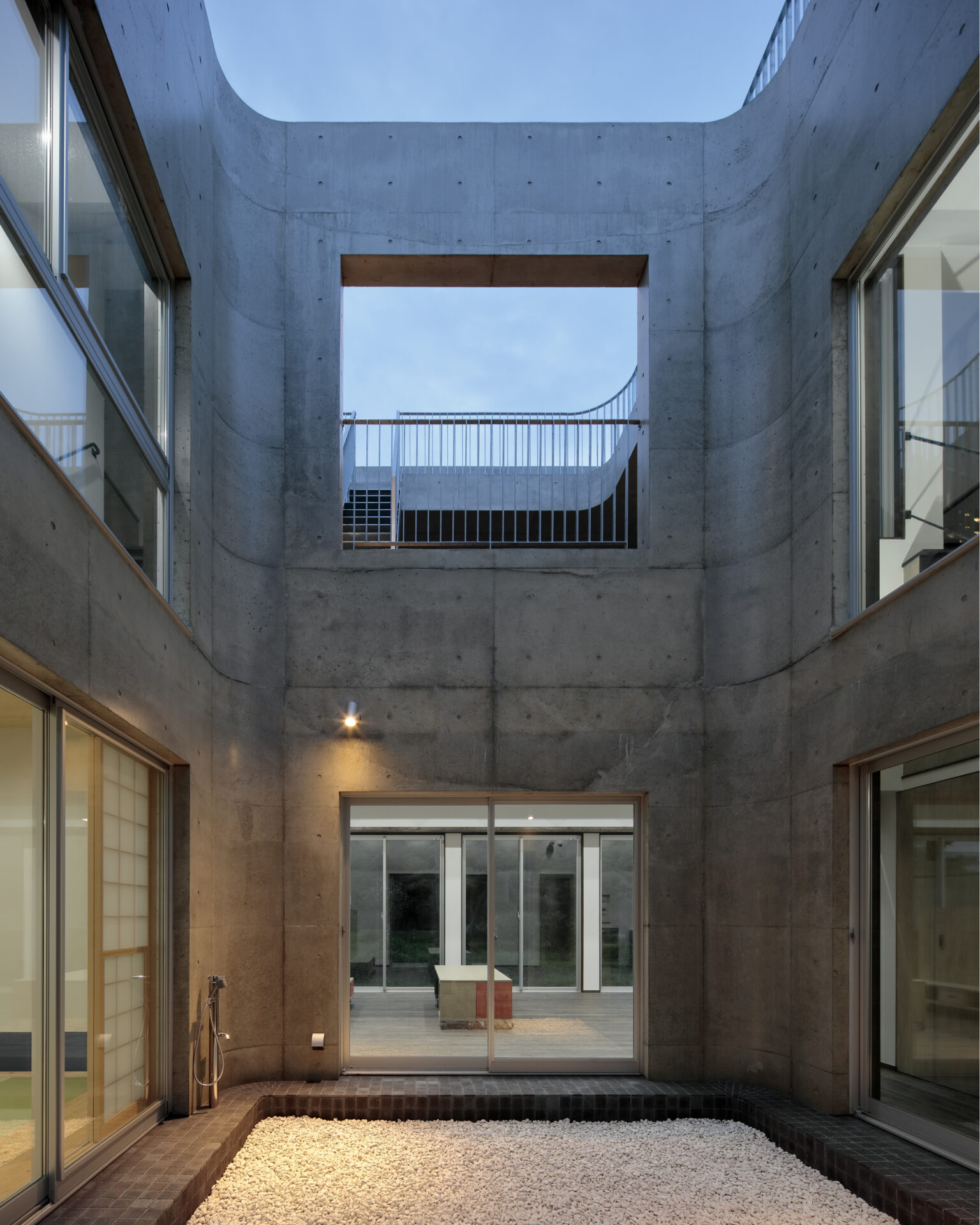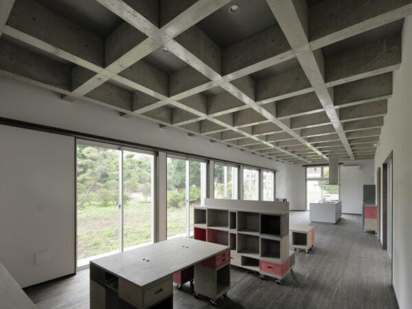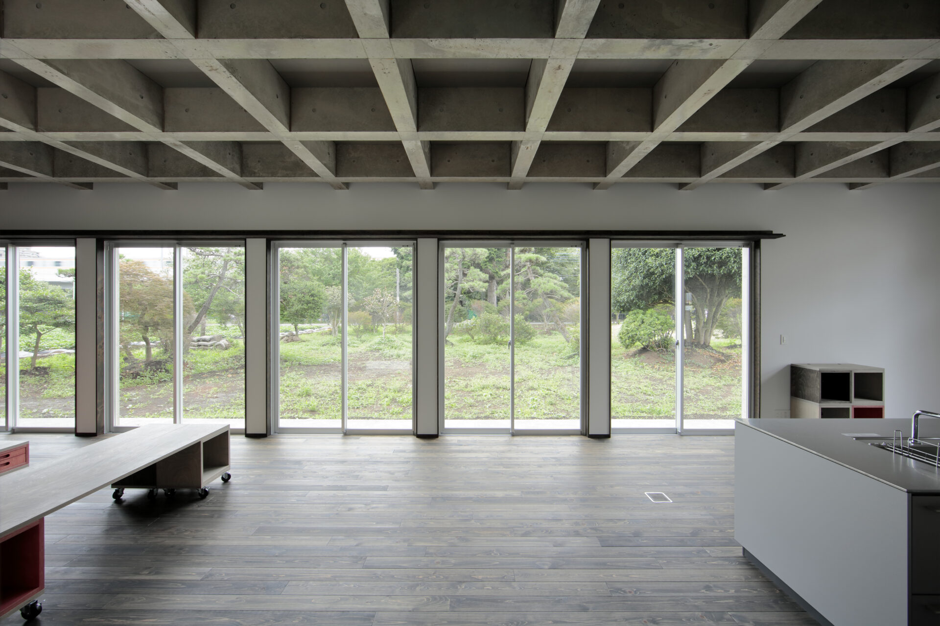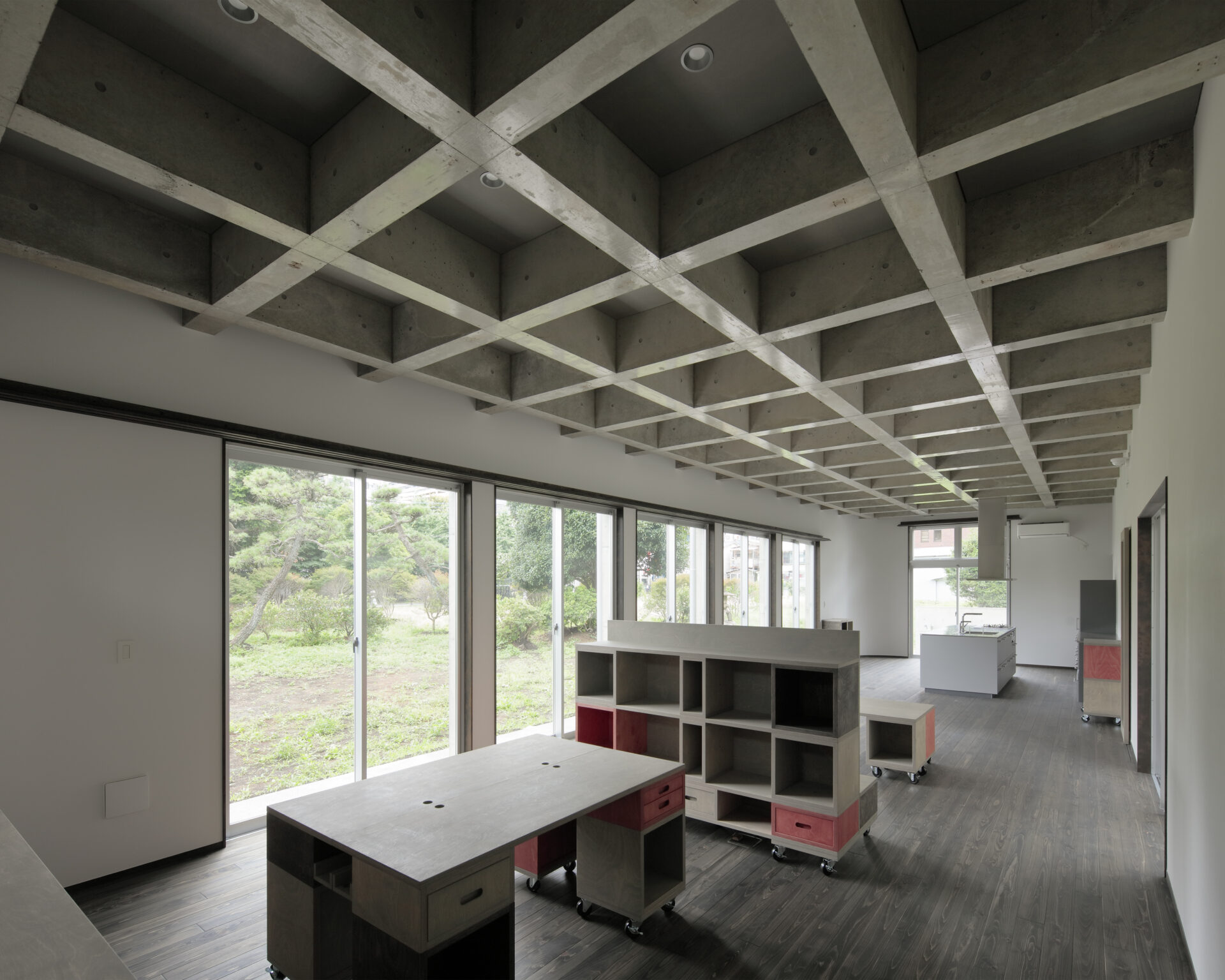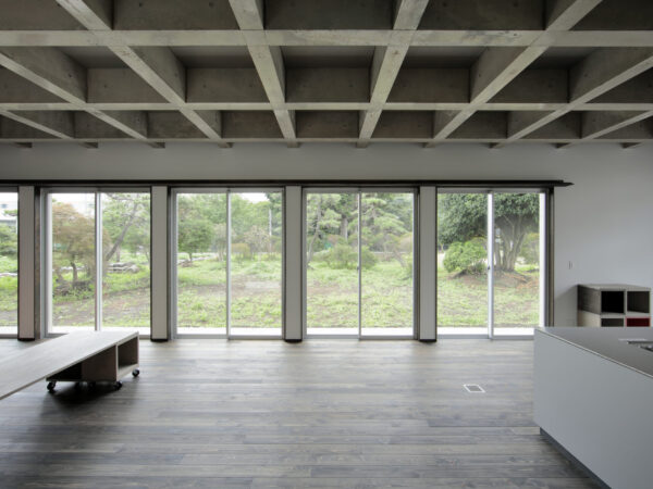 リビング空間は天井面をコンクリートの格子状の梁を用いることで、淡白な広い空間にならないように配慮し、柱のない大空間を実現しています。