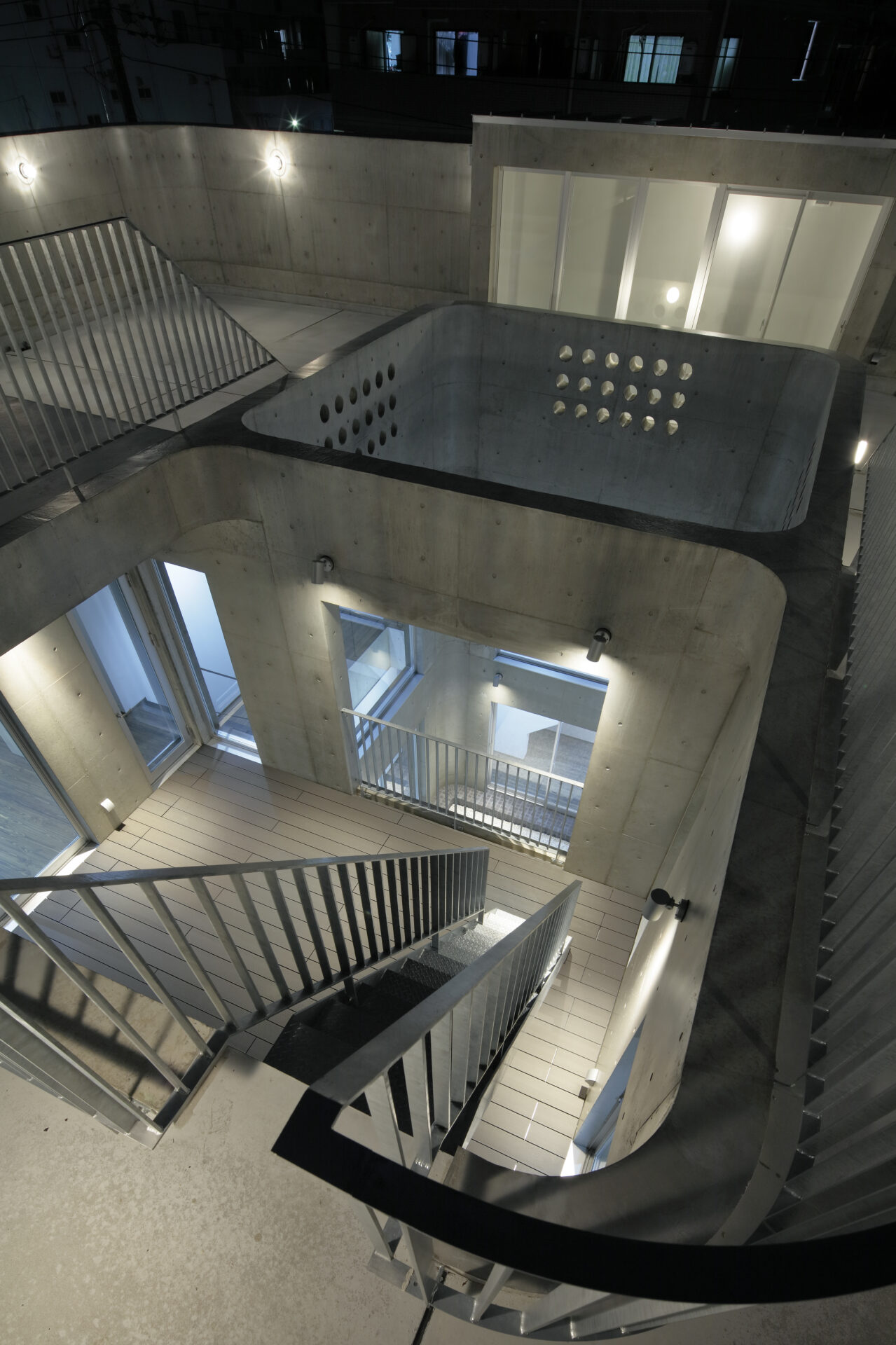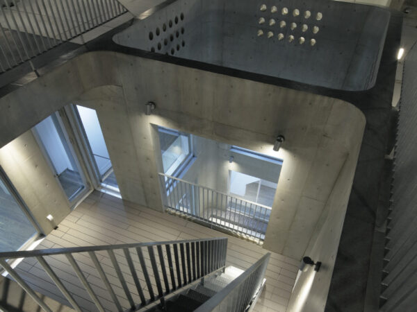 建物のカドに丸みをもたせて街区に圧迫感を与えないようにしつつ、アイコンとなる佇まいを目指しました。建物中心部には中庭を設け、いくつものテラスがあり、屋上も利用できる多孔質な構成は、建物内のどこにいても自然を感じることができます。