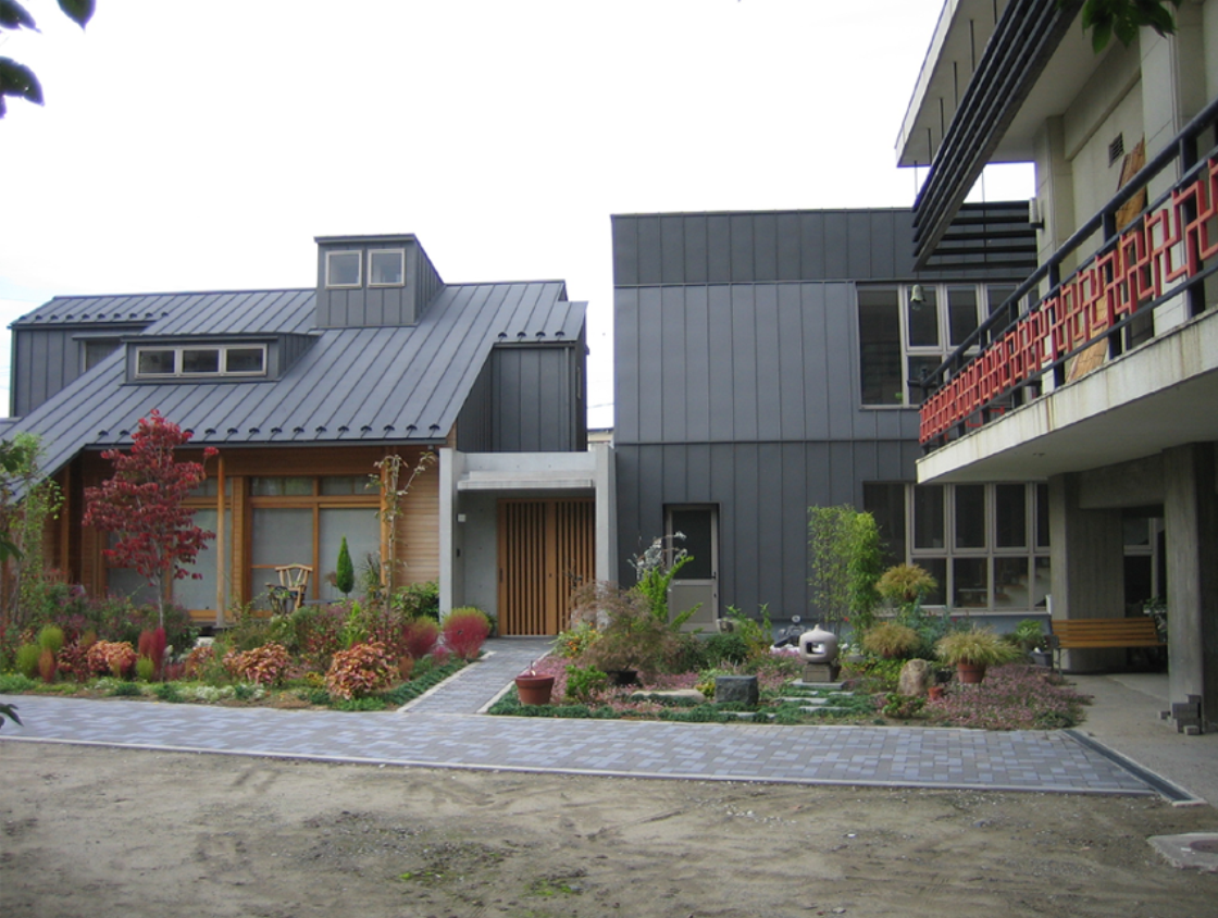 真言宗豊山派の寺院の境内にある本堂と信徒会館を改修し、庫裏を新築し信徒会館と連結した計画です。信徒会館には納骨堂を内包しています。順次再生しながら、まちの拠り所としての新しい寺院境内の全体像をつくり出すことを目指しました。