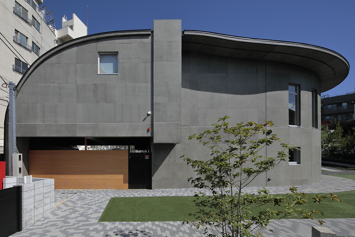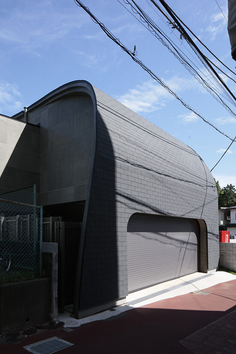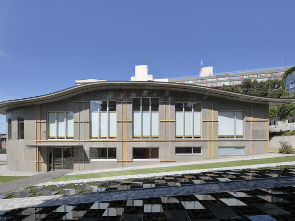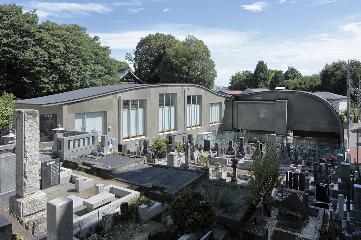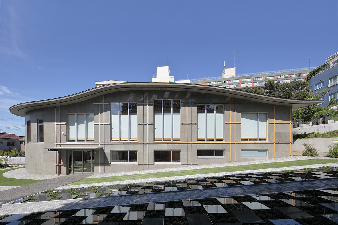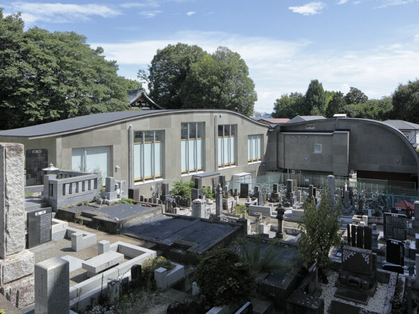 建築は敷地形状に合わせて弓なりの平面外形とし、屋根もゆるやかな曲面を描く。軒は深く出しむくりをつけ、既存の本堂と呼応しながら新旧の建物がたたずむ風景を期待した。西面の道路側は屋根の曲面がシームレスに壁となり地面に到達することで、ヴォリューム感を軽減する謙虚さと、曲面造形の主張を併せもつ表情をみせている。