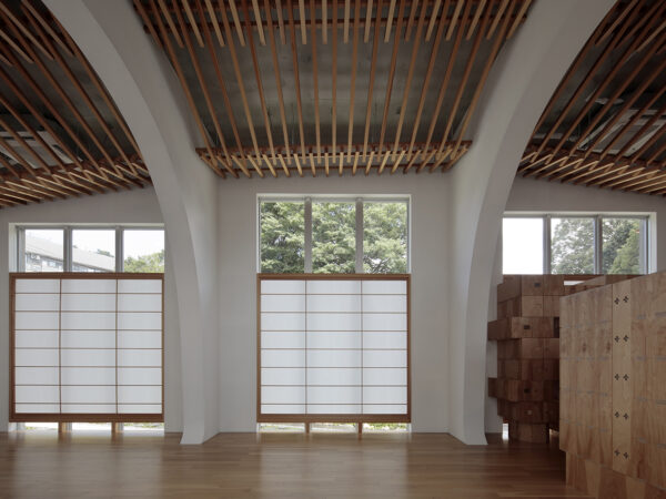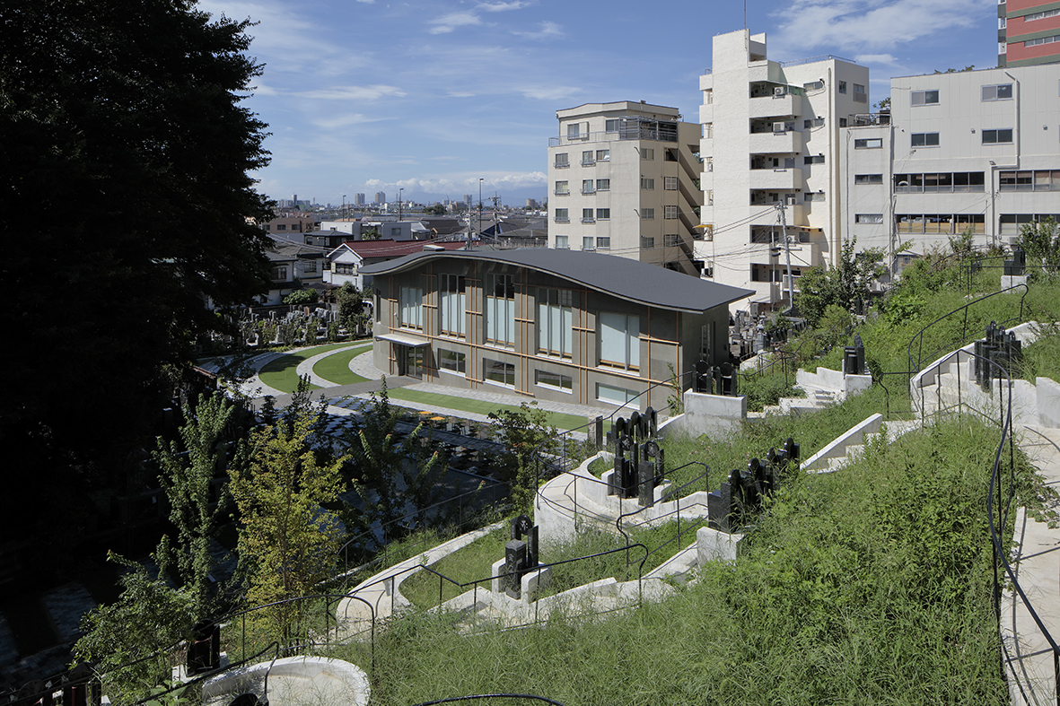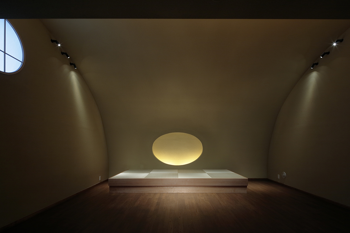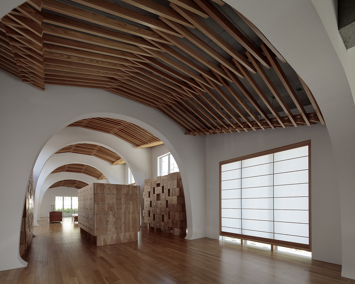 曲面をもつリニアな外形の中に、アーチ形開口のある耐力壁を等ピッチで配置し、この建物内の空間を分節し接続する。アーチを通過するたびに空間の異なりを感じることが、人間の死と切り離すことができないこの建物にふさわしいと考えた。納骨堂は屋根の曲面に応じた高低差に富む天井の空間性が確保できるが、屋根勾配と直行方向に設けた木製ルーバーがさらに助長している。