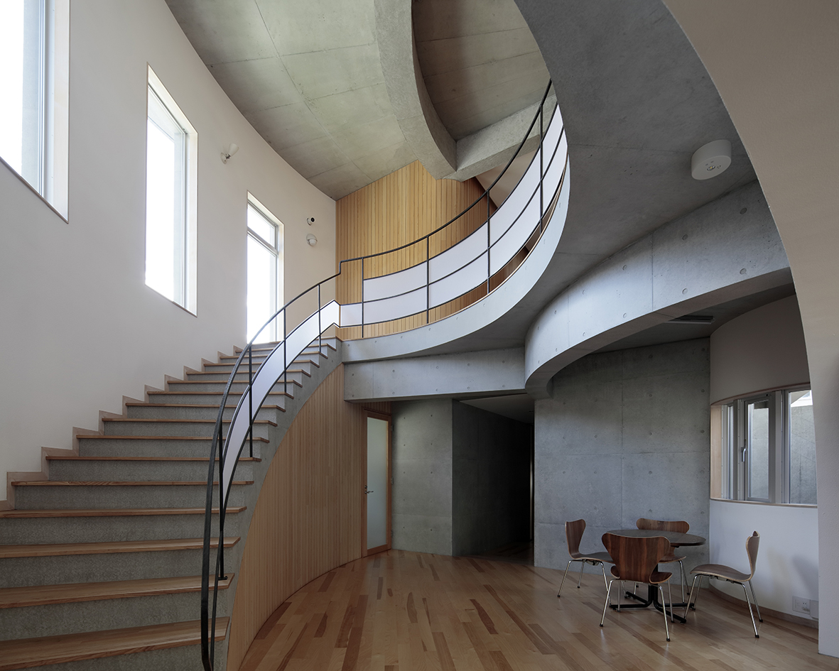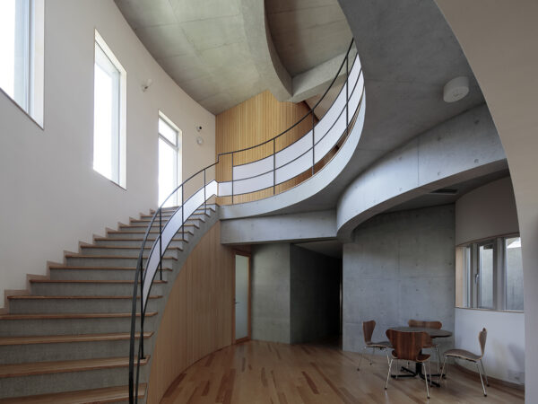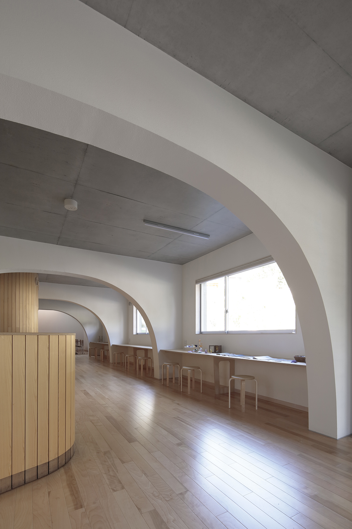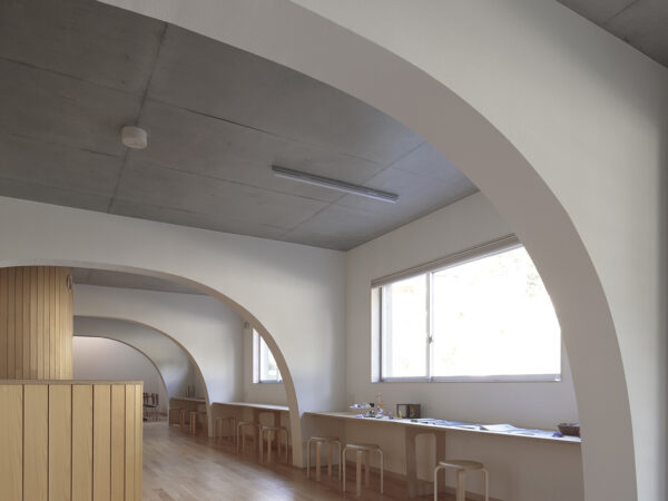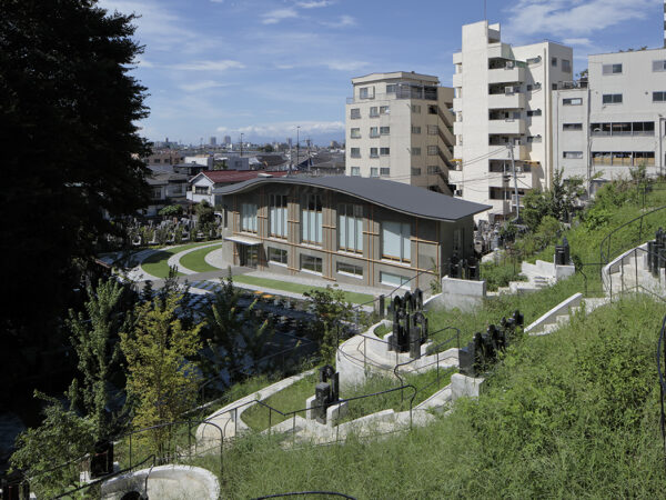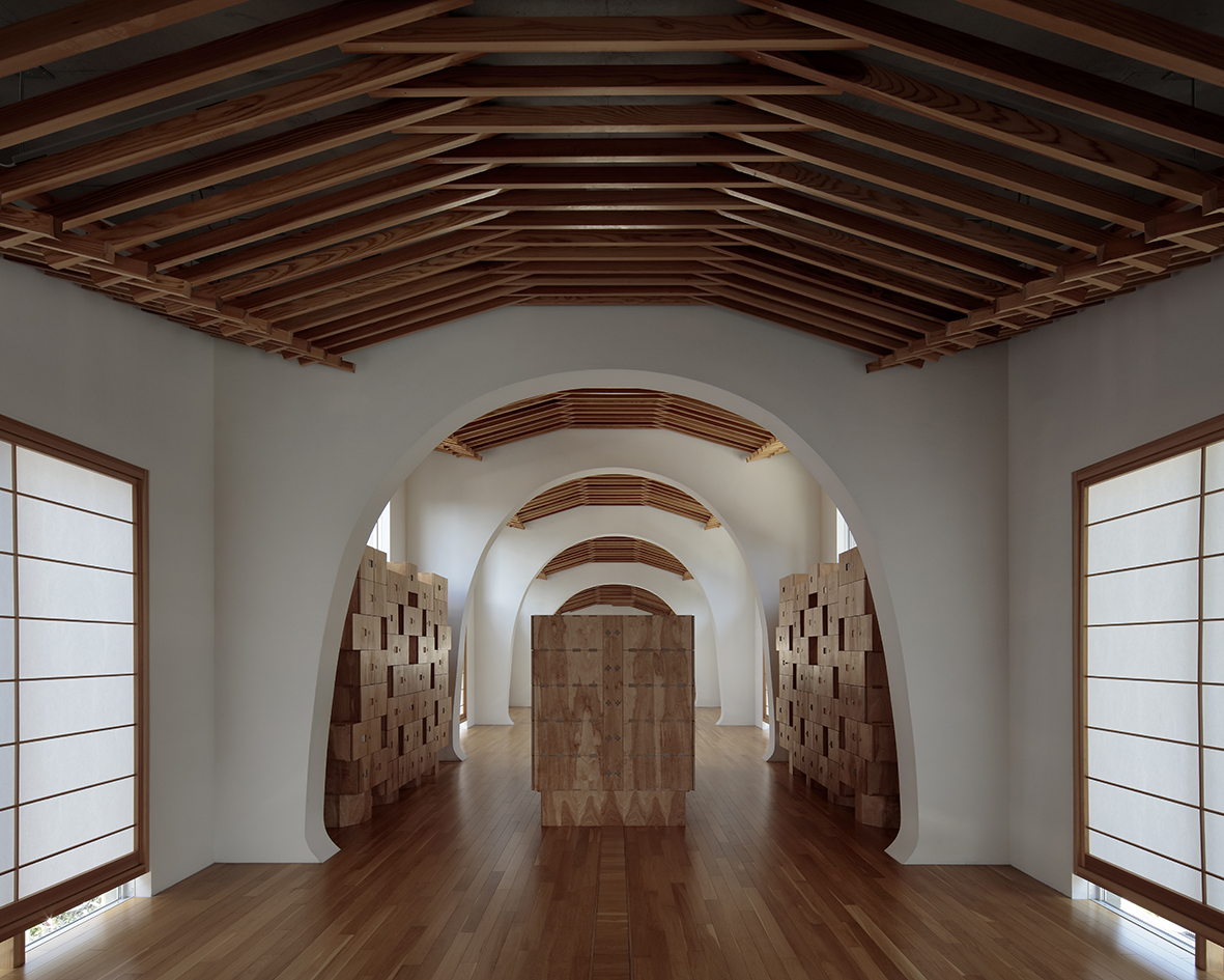 曲面をもつリニアな外形の中に、アーチ形開口のある耐力壁を等ピッチで配置し、この建物内の空間を分節し接続する。アーチを通過するたびに空間の異なりを感じることが、人間の死と切り離すことができないこの建物にふさわしいと考えた。納骨堂は屋根の曲面に応じた高低差に富む天井の空間性が確保できるが、屋根勾配と直行方向に設けた木製ルーバーがさらに助長している。