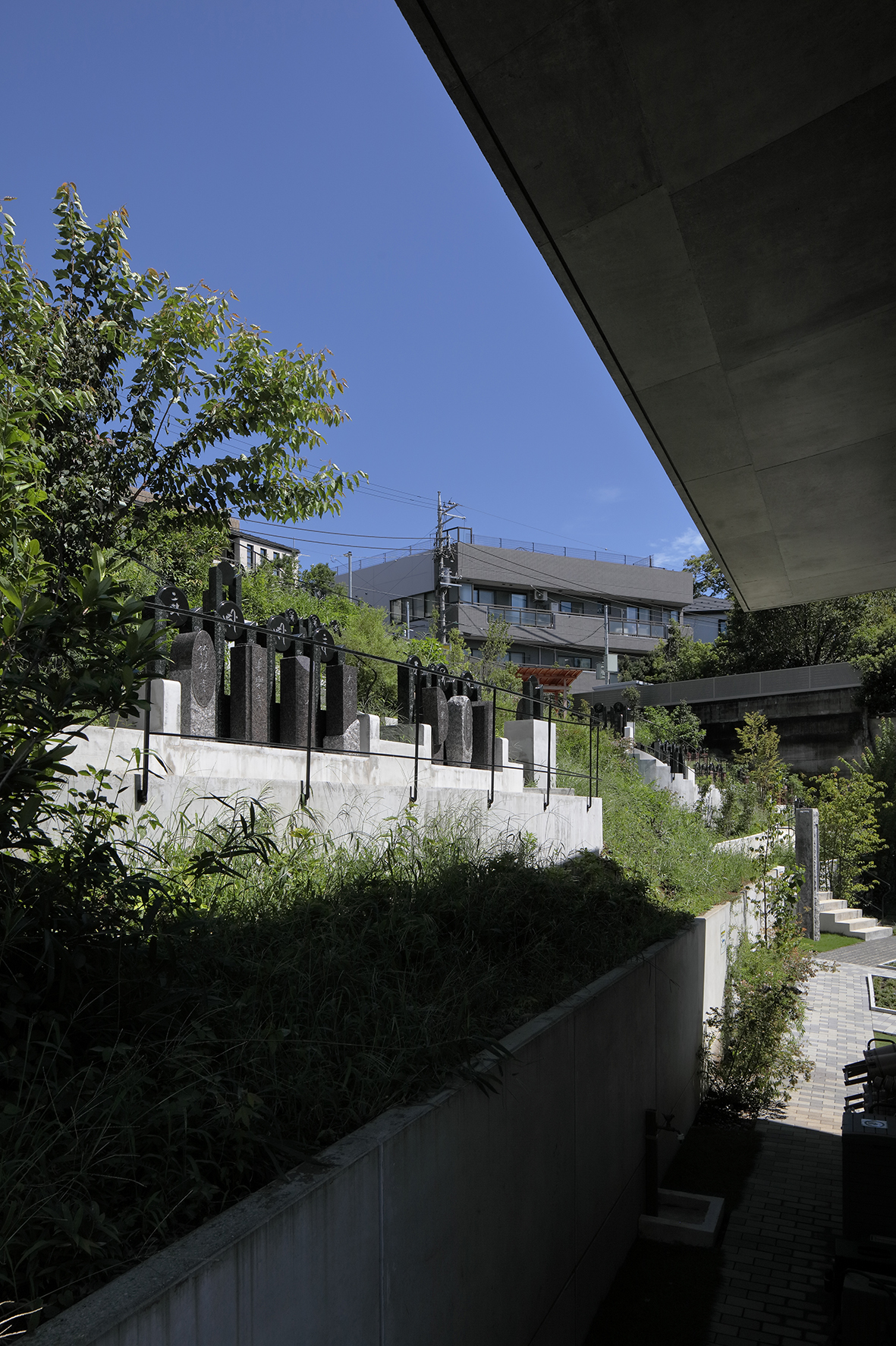 国分寺崖線に位置するこの敷地は、国分寺市から三鷹市までの東西に延びる「はけ」と呼ばれる崖地にあり、崖の中腹からは古来より重宝された地下水が湧き出ている。金蔵院は小金井市で最も古い寺院で、正門からは室町時代から参道だったであろう「はけの道」が始まり、一定の軸線をもっている。境内に隣接した西側の一団の土地を数年前に所有したことから、ここに新たに礼拝堂や納骨堂を建築する計画が始まった。外構では墓地、湧水を活用した小川、崖には八十八箇所巡拝路も計画された。八十八箇所巡拝路とは、四国にある弘法大師・空海ゆかりの88カ所の仏教寺院を巡礼するための道であり、いわゆる遍路のミニチュア版である。ほこらや踏み砂などの適切な設えをすることで、四国遍路を行ったのと同等の価値があるとされる。