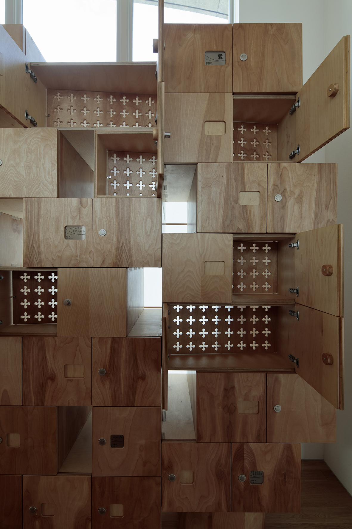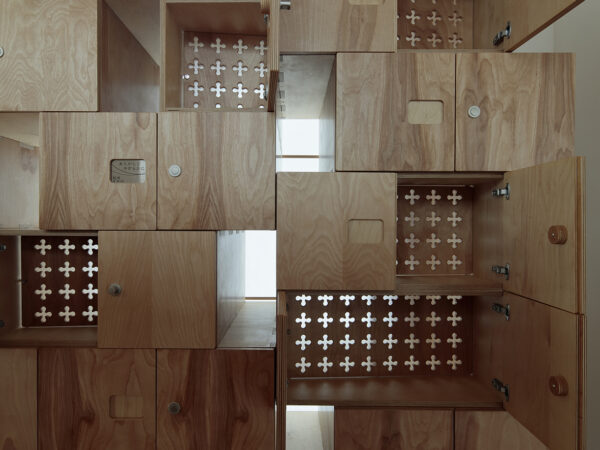 納骨壇は均質化されたロッカー形式にすると扉の面が開口部をふさぎ暗くなる。そこで、ところどころに隙間を開けて自然光を取り込みながらランダムなパズルのように組み合わせる造形とした。さらに、納骨壇の扉を開けると骨つぼの奥から障子を介した自然光が後光のように内部を照らしてくれる。